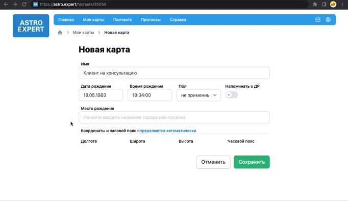 Программа получает долготу, широту и часовой пояс места рождения в базах данных Google. А для рожденных в СССР часовой пояс она проверяет по «Справочнику астролога».