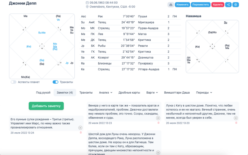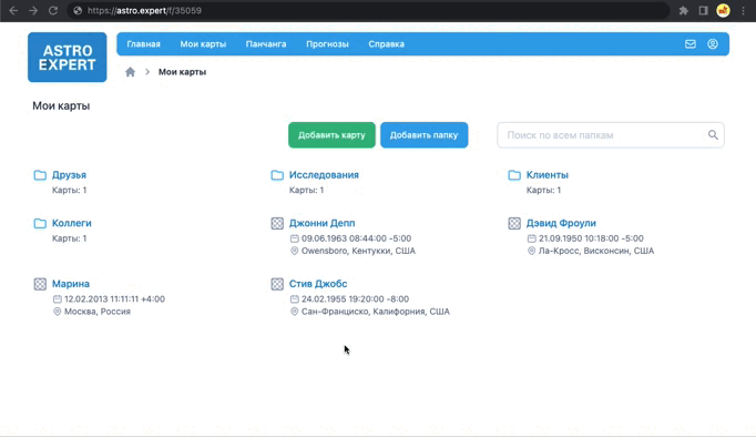 Быстрое добавление карты, быстрый поиск, последние открытые карты, текущие транзиты, ваша карта рождения с транзитами и панчанга на сейчас – все это на главной странице.